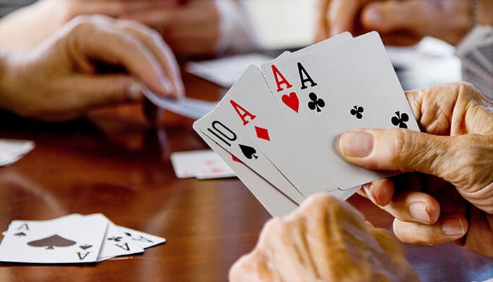 A group of people playing a card game, one person holding multiple cards in their hand, illustrating a friendly game of Canasta and how to play Canasta in social settings